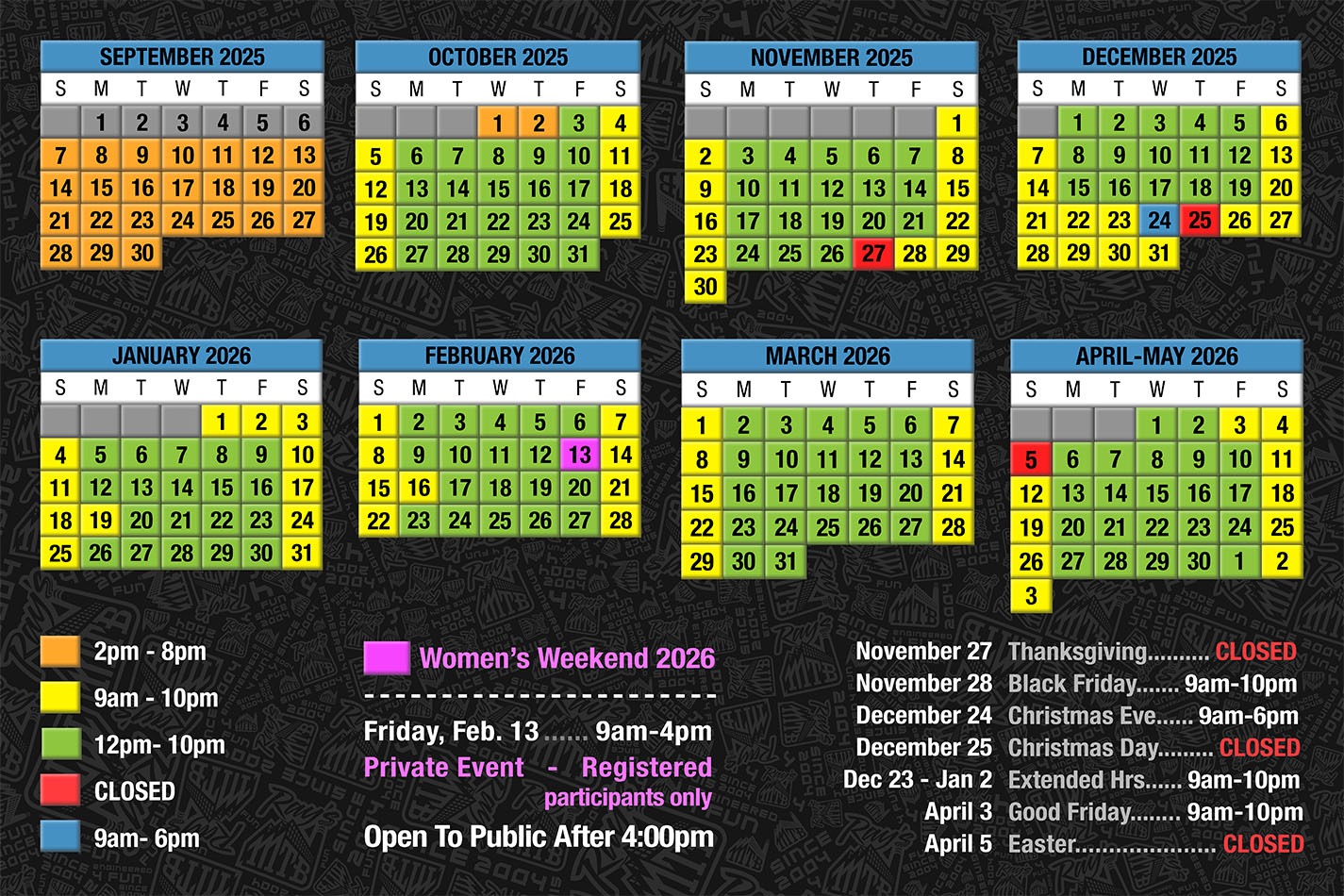 The park is open seasonally, typically from the first weekend of October to the last weekend of April. Exact opening and closing dates vary from year to year. The park is closed for the off-season. During the summer the park is open for riding only on Sunday nights from 2:00pm-8:00pm. Special holiday hours will be announced each year on our social media.
